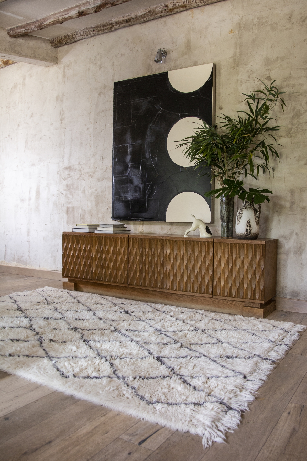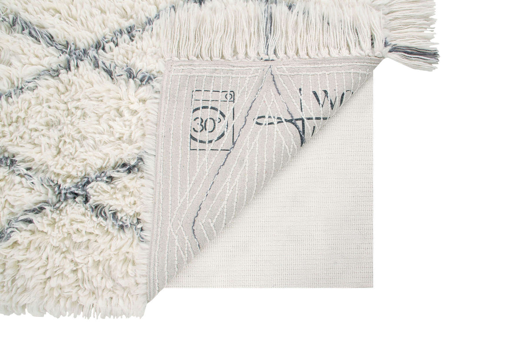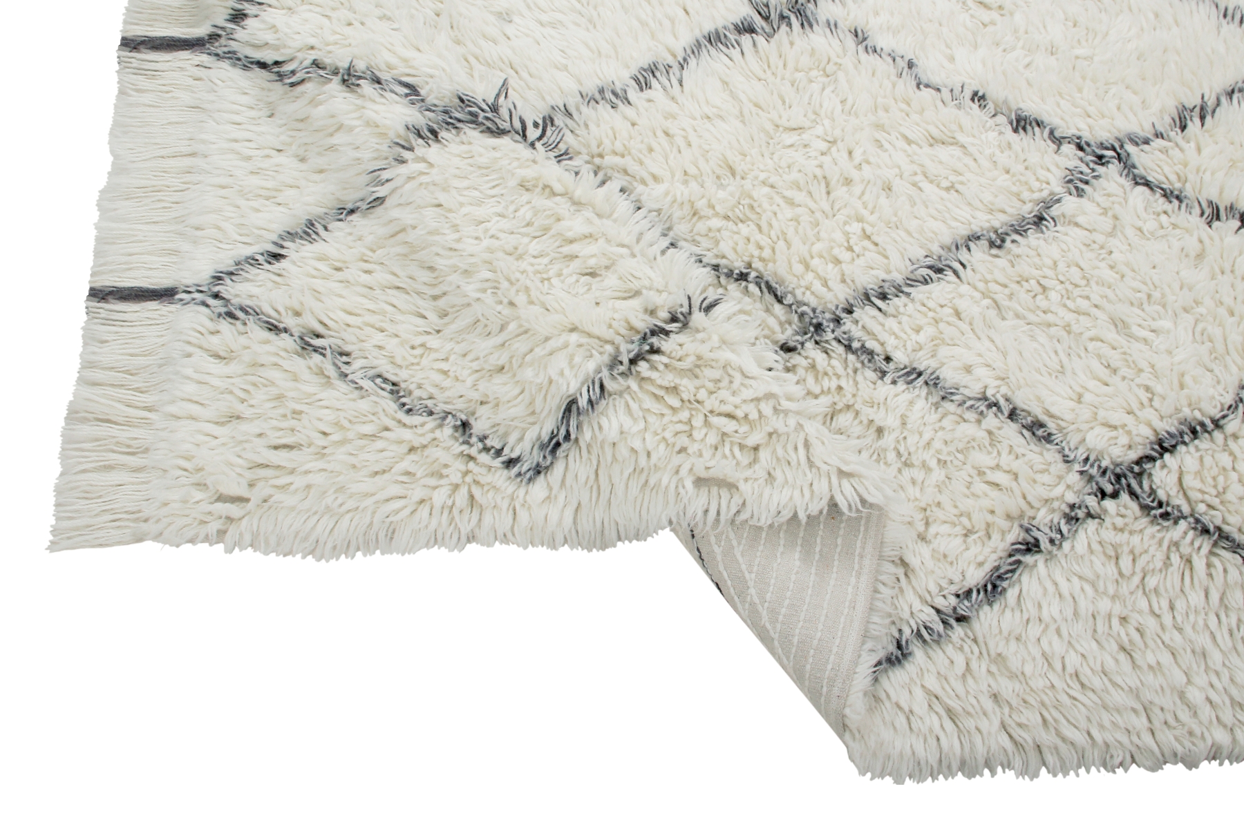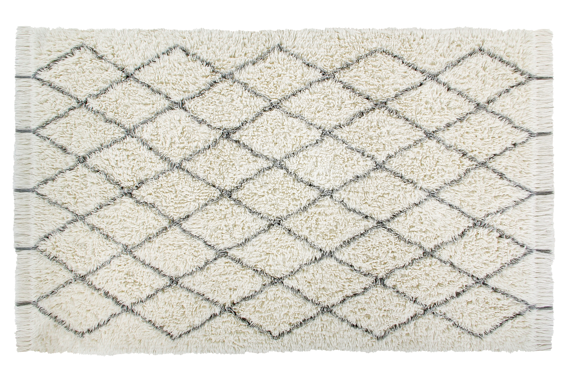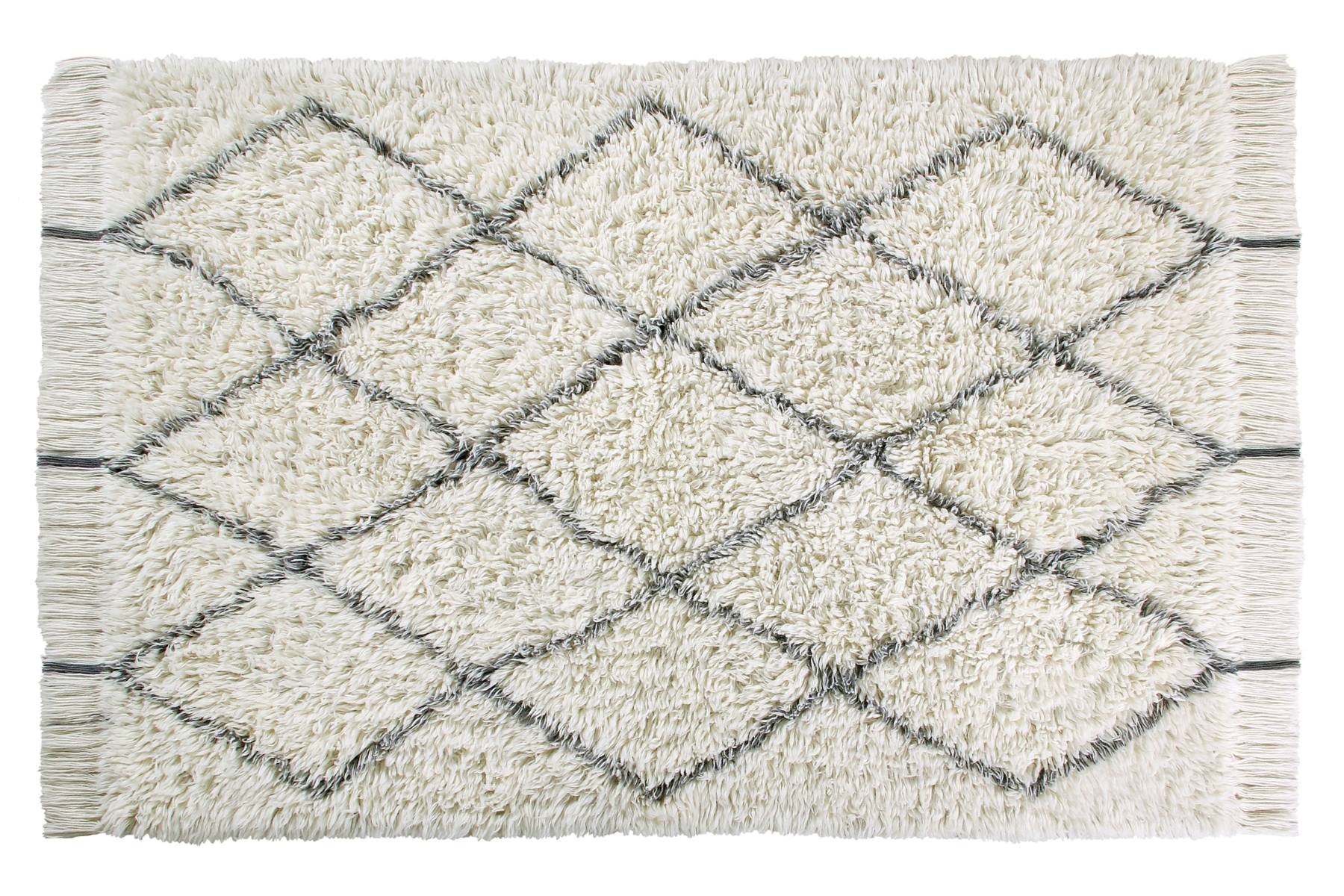 Prostokątny, wełniany dywan do prania w pralce. Dywan z klasycznym motywem inspirowanym berberyjskim wzornictwem, z miękkim i puszystym długim włosiem, wykończony gęstymi frędzlami na brzegach. Ten miękki i przytulny dywan z pewnością nada Twojemu wnętrzu artystycznego charakteru.