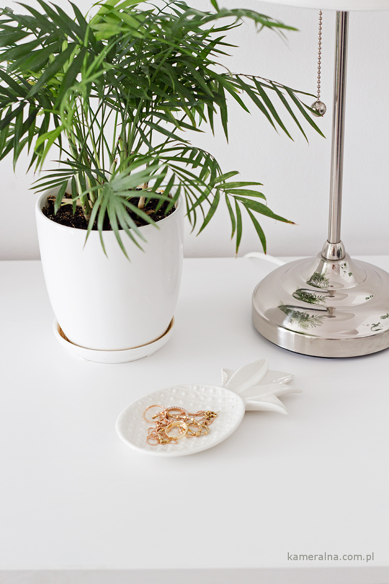 Tacka White Ananas w przedpokoju? Czemu nie? Zastosuj ją jako miejsce do odkładania kluczy i innych drobiazgów potrzebnych podczas wychodzenia z mieszkania. Jeśli chcesz posłużyć się tacką w sypialni, wykorzystaj ją jako podkładkę pod biżuterię, której najczęściej używasz.